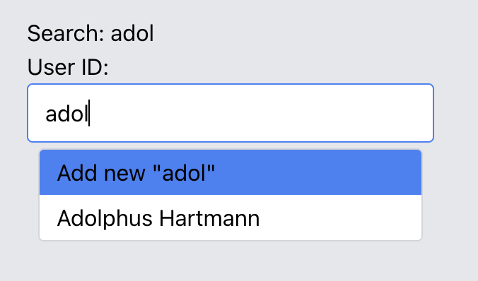 As an example, lets create a user combobox, which will allow us to search through existing users and select one of them. It will also allow us to enter the name of a user that doesn't exist so a new user can be created later.