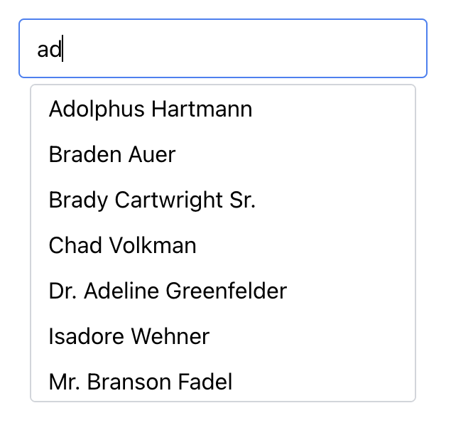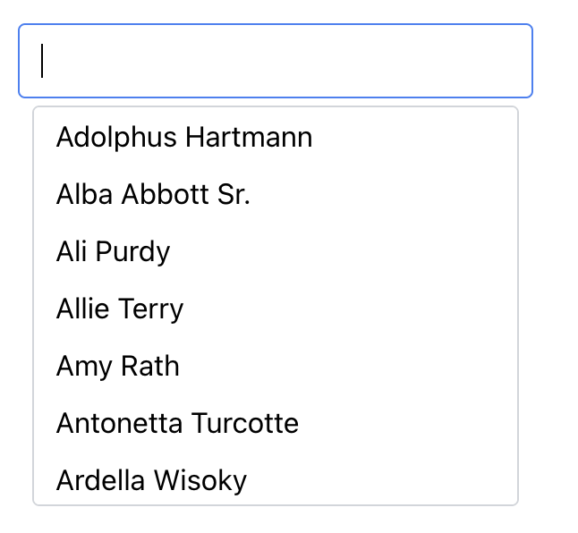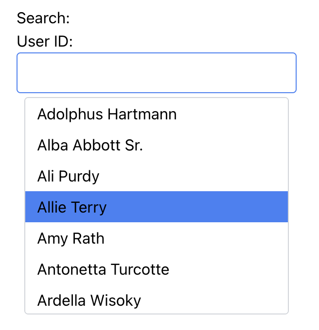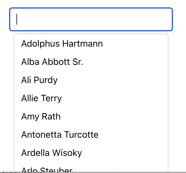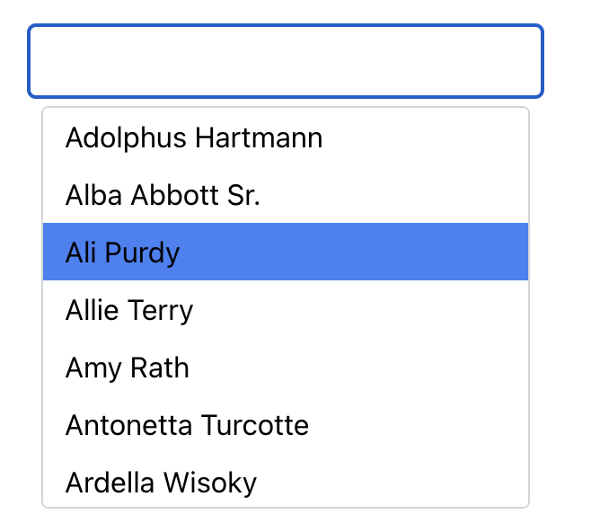 Let's go back to our browser, refresh and click on the input, we can see our users. If we now arrow down, we can see the first result gets highlighted. We can keep arrowing down or up to highlight the next/previous result.